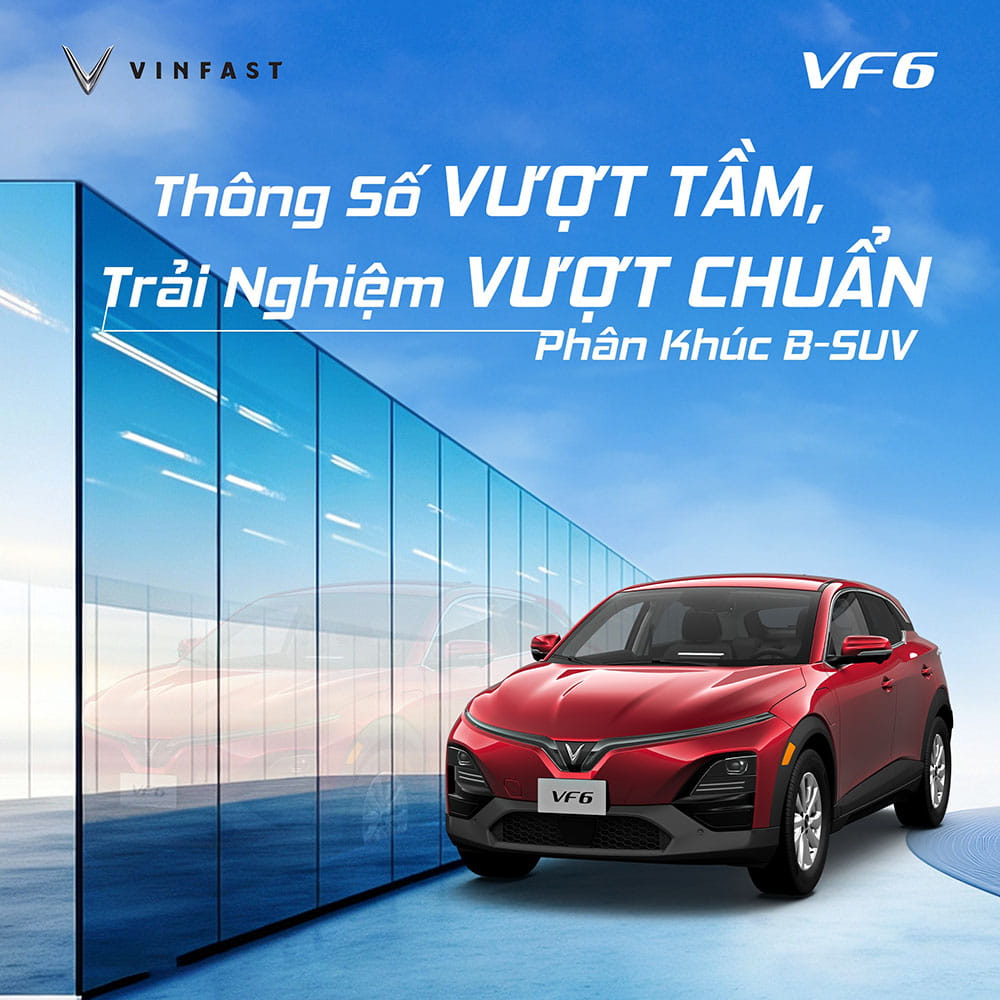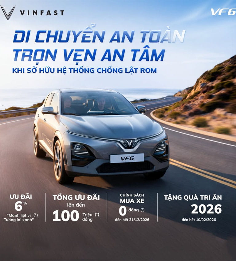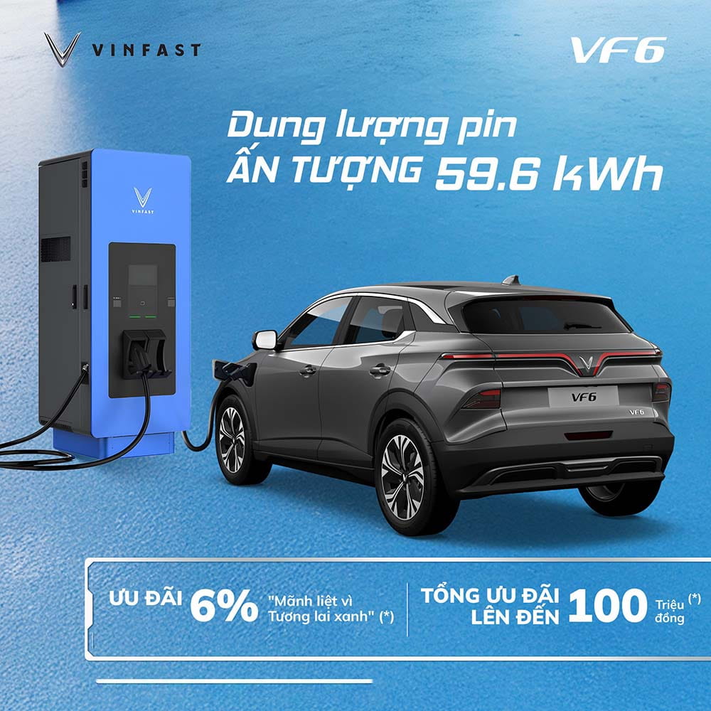 Thời điểm TỐT NHẤT NĂM mua xe VinFast VF 6 với nhiều ƯU ĐÃI CHƯA TỪNG CÓ. Giảm trước bạ đến 100%, tặng phụ kiện CHÍNH HÃNG, hỗ trợ bảo hiểm CAO CẤP, tặng thẻ dịch vụ VÍP, miễn phí sạc 3 NĂM, hỗ trợ trạm sạc TẠI NHÀ, cam kết MUA LẠI, trả góp đưa trước 0 ĐỒNG KHÔNG LO LÃI và nhiều phần quà khác TỔNG ĐẾN HÀNG CHỤC TRIỆU ĐỒNG. Gọi ngay HotlineZalo hoặc đăng ký ngay bên dưới để biết thông tin khuyến mãi VF 6 CHÍNH XÁC NHẤT:
